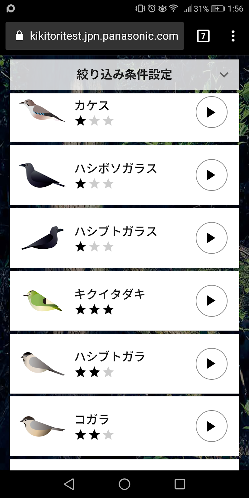 そこではじめは聞き取りやすい星1の野鳥の声を流していき、聞き取りづらいヤブサメといった鳥の鳴き声を流してみます。